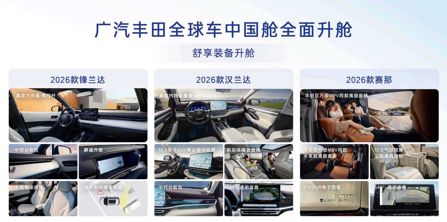 如果说这次产品升级用什么关键词最能概括,那一定是“入门价值大幅提升”。四款2026款全球车在智能化、高价值感等方面全面进阶,且多数升级均为“全系标配”。广汽丰田没有在顶配车型上堆砌“炫技型配置”,而是选择把用户最常用、最有感知、最需要的功能下放至入门版,直接提升入门版的高价值。