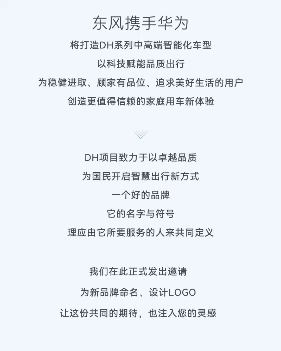 10月9日,东风奕派官方微信公众号宣布,正式为东风与华为联手打造的DH项目公开征集品牌中文名和LOGO。这一动作标志着东风汽车与华为的战略合作进入品牌化运营新阶段。