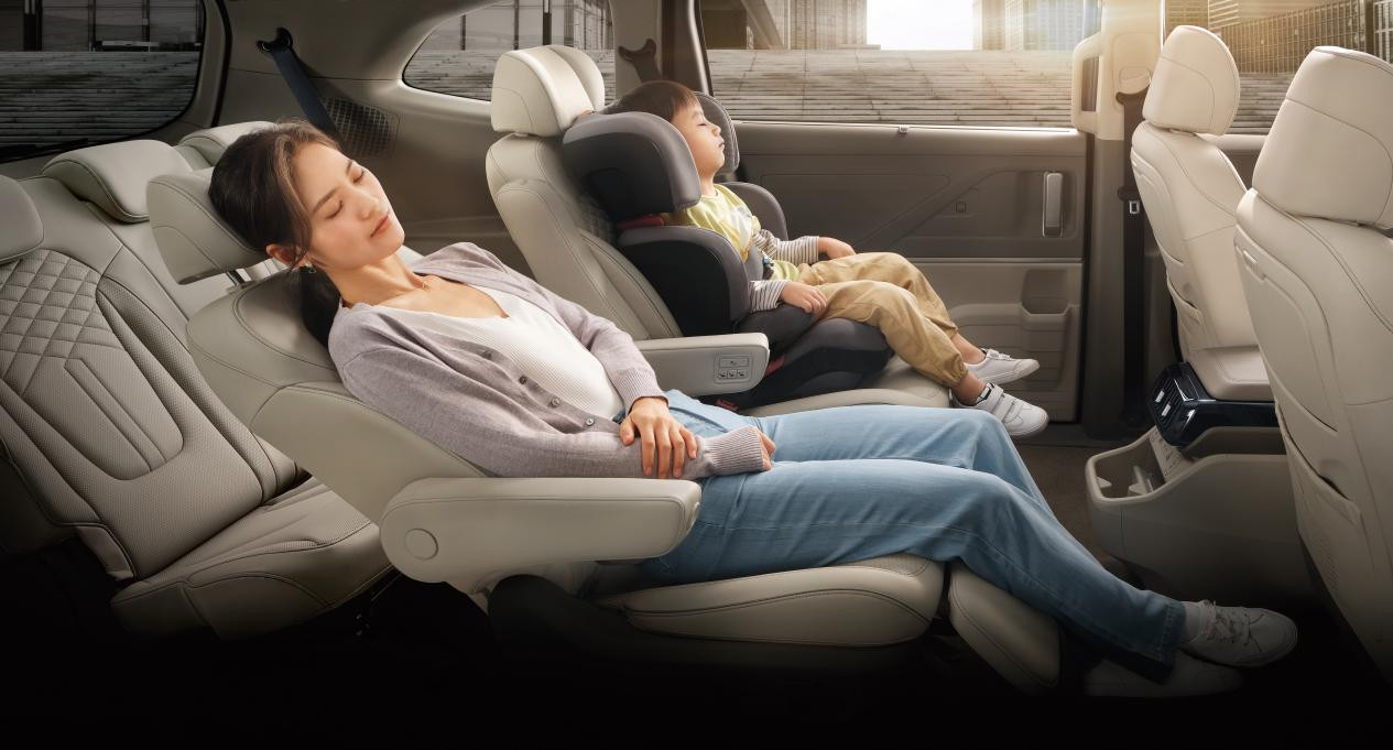 以专为多孩与三代同堂的家庭设计的库斯途为例,以3055mm超长轴距和2+2+3真七座布局,彻底告别了“伪7座”的尴尬。库斯途的二排腿部空间达到1128mm,同时配备的零重力座椅支持前后/靠背调节,带小桌板和杯架,堪称移动的“头等舱”。而第三排也不再是临时座位,是真正可长时间乘坐的舒适空间,977mm头部空间和790mm腿部间,可轻松容纳1.8米身高的成年人长途乘坐。座椅靠背支持角度调节,坐垫厚度也进行增加,让“长途不是妥协,让“享受”这件事真正变得可日常。