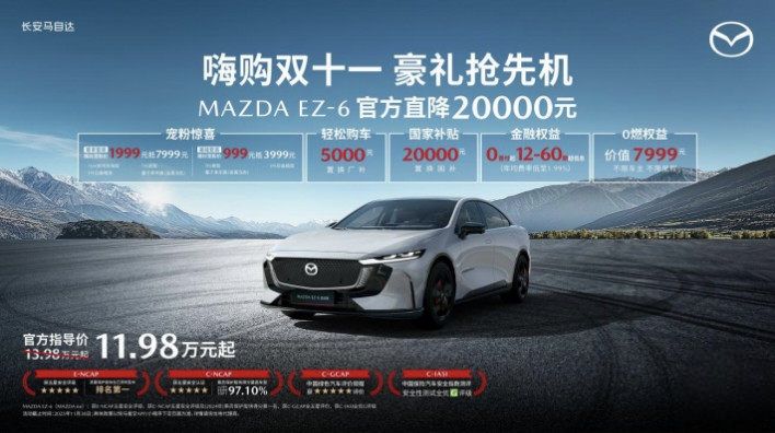 MAZDA EZ-6则于11月1日起启动官方降价,全系车型起售价降至11.98万元,并叠加高额置换补贴与金融政策,包括置换厂补5000元、国补20000元及同享0燃权益,进一步巩固其作为“合资新能源B级轿车价值标杆”的竞争力。