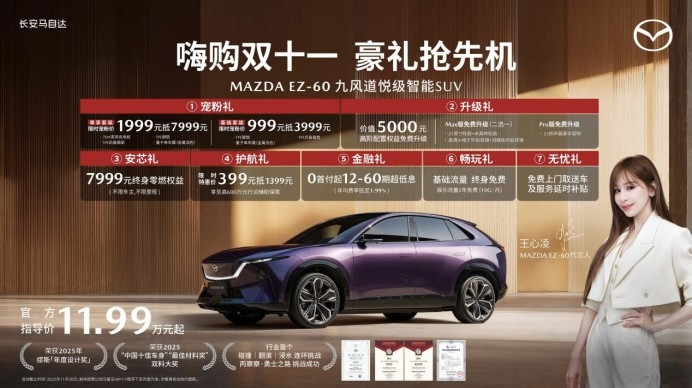 作为盛典的重头戏,长安马自达宣布旗下两款主力新能源车型——MAZDA EZ-60与MAZDA EZ-6推出多项限时购车权益。即日起至11月30日,用户购买EZ-60或EZ-6可享受“宠粉礼套装”,包括999元抵3999元基础套装(含TPE脚垫、后备箱垫及量子单车膜)或1999元抵7999元尊享套装(含7KW家用充电桩及上述配件)。此外,EZ-60 MAX版用户可免费升级21英寸深凹轮毂与米其林轮胎或高清AI电子外后视镜;PRO版则可升级23扬声器豪华音响系统,价值均达5000元。