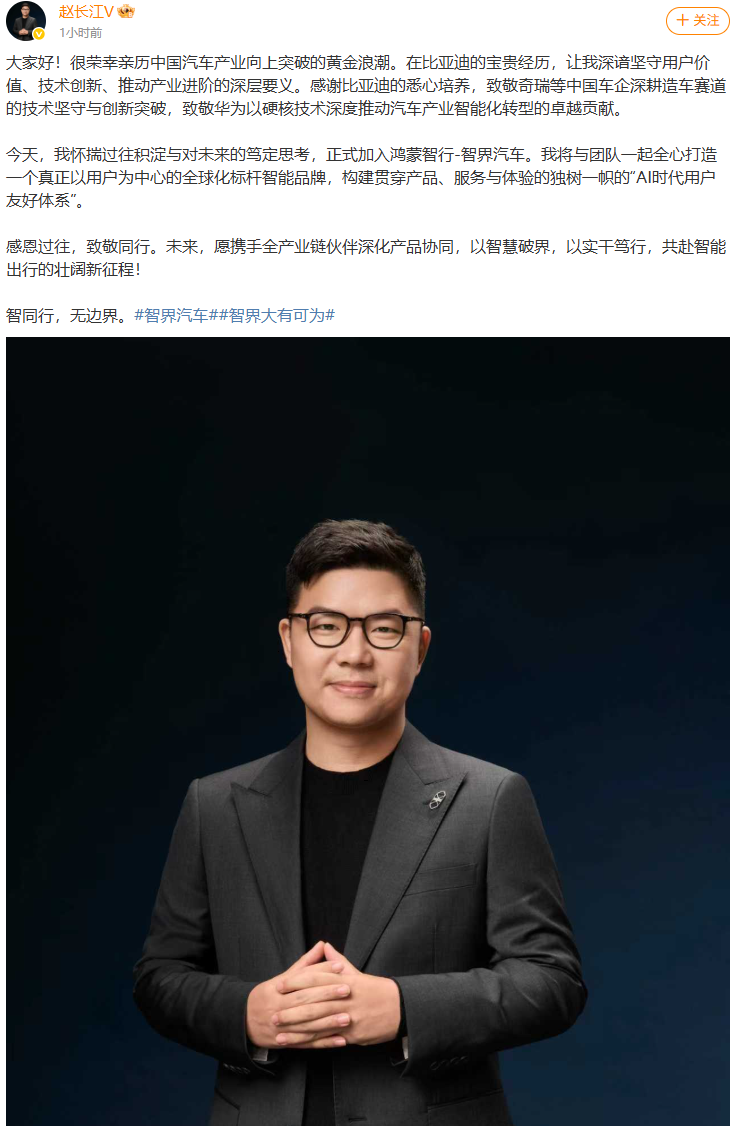 1月13日,前比亚迪腾势方程豹直营事业部总经理赵长江在个人微博正式宣布,加入鸿蒙智行旗下的智界汽车,担任执行董事及执行副总裁。他的微博认证信息已更新为新职务。