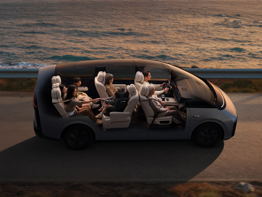 MEGA的设计显然偏向优雅而非运动,更适合那些注重品味又需要超大空间的家庭用户。车身尺寸为5350×1965×1850mm,轴距达到3300mm,属于名副其实的大型MPV。其“子弹头”造型与水滴形车身注定引发争议。有人戏称它像“高铁列车”,有人却认为这是“未来科技”的具象化表达。但数据不会说谎:0.215Cd的风阻系数,使其成为全球量产MPV中最低的车型,甚至优于特斯拉Model X(0.24Cd)和保时捷Taycan(0.22Cd)。