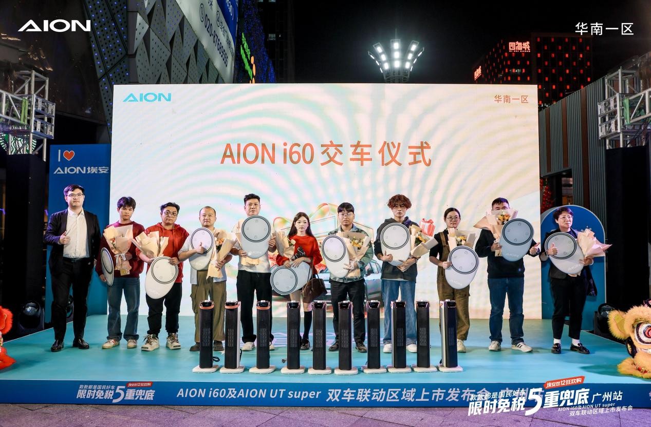 2025年12月24日,在圣诞平安夜的璀璨灯光下,广汽埃安在番禺万达广场隆重举行AION i60及AION UT Super双车联动区域上市发布会。活动现场以“限时免税5重兜底”为主题,融合传统醒狮文化与现代智能科技,为广州消费者呈现了一场充满东方智慧与创新精神的汽车盛宴。