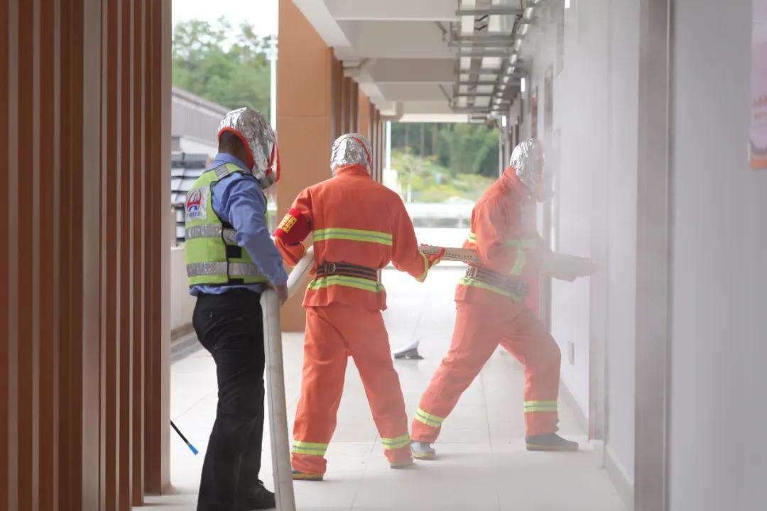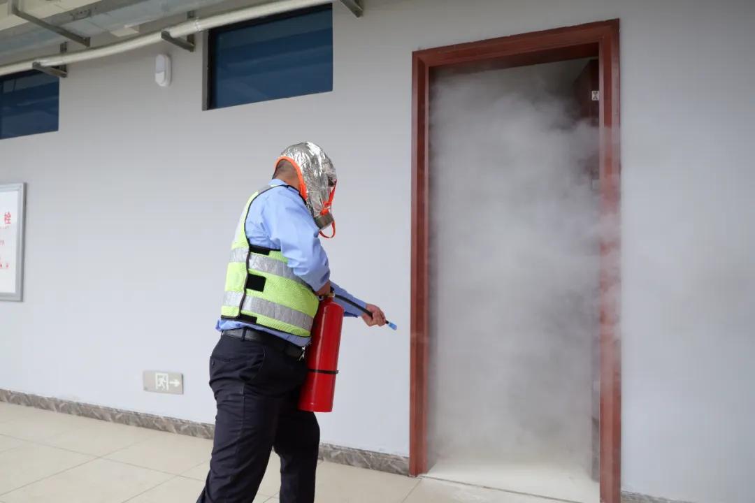 演练场景为当班巡逻协管员罗肇兵正在例行巡查时,发现206号宿舍门缝正冒出烟雾,开门看见隐约有火光。他冲出去紧急按下走廊的消防警铃,并报告消防控制室。“着火了!大家快撤!”刺耳的警报声响起,他边大声呼喊提醒附近人群,边拿起楼道的灭火器尝试扑救,但由于浓烟较大,无法进入。