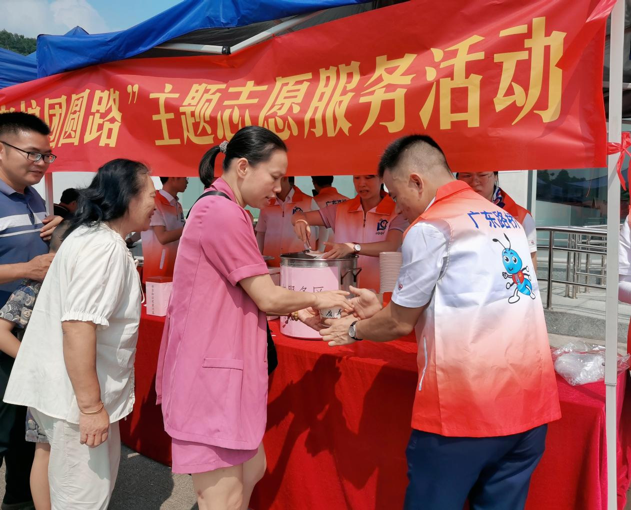 “我在服务区遇见家乡味”摊位前,早已围满了来自五湖四海的旅客。志愿者们轻轻舀起用肇庆市鼎湖山泉水精心熬制的山水豆腐花,小心翼翼地盛进碗里,并将一碗碗冒着热气的豆腐花递给每一位旅客,还不忘贴心地叮嘱一句:“小心烫,慢慢享用!”