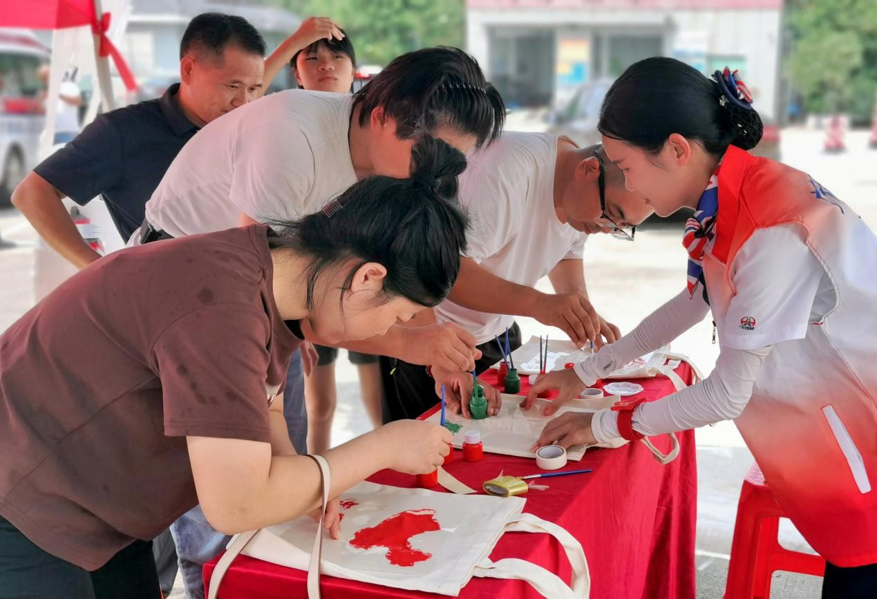 志愿者王洁赶忙拿起雕刻精美的中国地图拓印版,手把手教他:“先把布包放平整,用胶布把拓印版固定好,再蘸颜料涂在镂空处,中国地图就出来了。”现场的志愿者们也忙着为每一位参与者递上颜料和画笔,还不时地帮助大家调整拓印的位置,确保拓印效果更加完美。