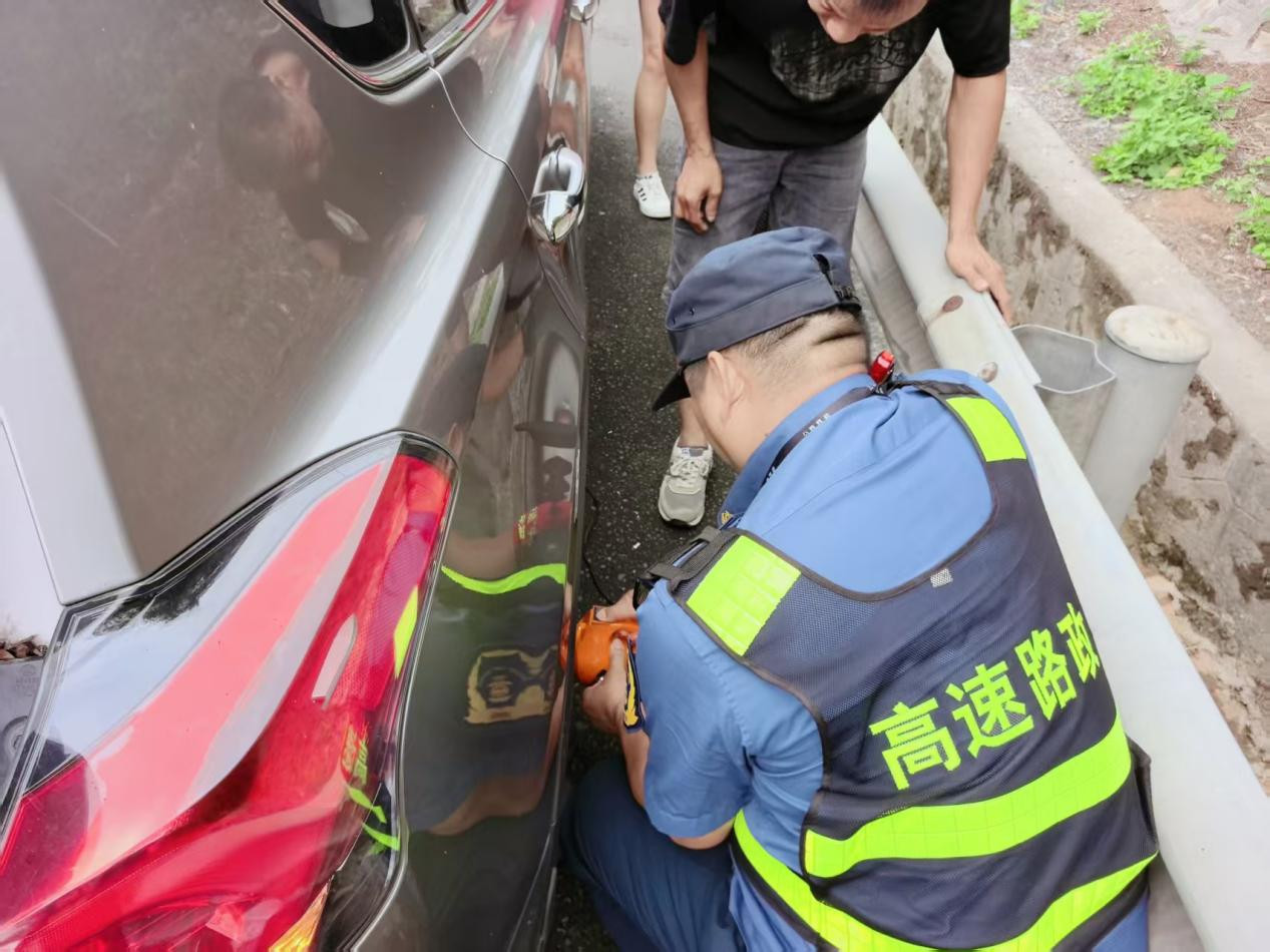 无独有偶,在10月6日的夜晚,路政员在巡查中,发现一辆白色轿车滞留在广州方向古水站出口匝道紧急停车带。路政员发现后立即上前了解情况,得知是车辆左后轮爆胎后,路政员表示:“师傅别急,我们帮您换!”
