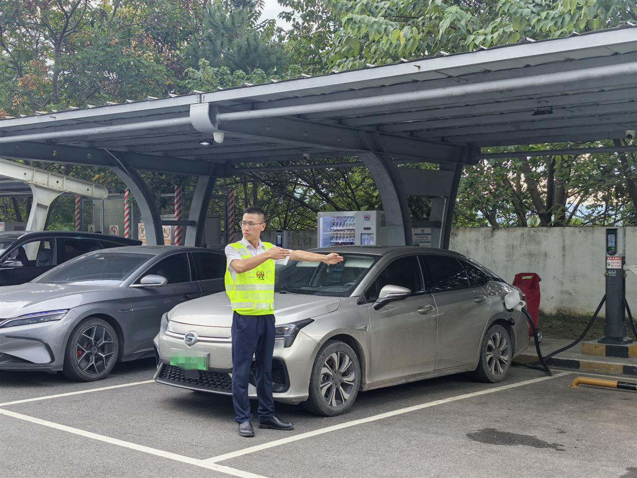 返程车流高峰期间,进入青龙停车区休整的人流量大。为保障停车区稳定运行,二广高速安排志愿者在停车区入口及场区内驻守,引导车辆有序进入、规范停放,并协助维持充电车辆排队秩序。同时,通过增加标识、场区广播和临时大喇叭等,指引司乘人员有序停车。