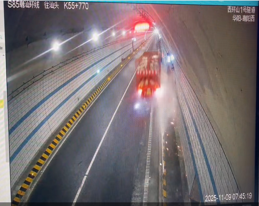 11月9日,潮汕环线高速往汕头潮南方向西环山1号隧道内,一辆重型货车突发失控,车身擦撞道路设施后未停车便驶离现场。事发后,路政人员迅速启动应急处置程序,清理现场残留杂物并排除隐患,同步对接辖区交警,提交事故初步勘查信息,申请协助追查逃逸车辆。