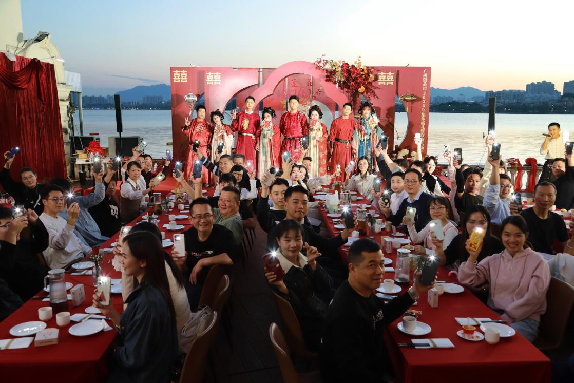 婚礼以“渡船启航”拉开序幕。新人们身着传统中式礼服,在热情的欢呼声中,携手踏上精心布置的“幸福之舟”。船身装饰着鲜花与彩带,寓意着新人未来的生活五彩斑斓、充满希望。随着船缓缓前行,同事们纷纷抛洒花瓣,送上最真挚的祝福,现场气氛温馨而浪漫。新人们在这特别的仪式中,仿佛共同驶向了幸福的港湾,开启了他们人生新的篇章。