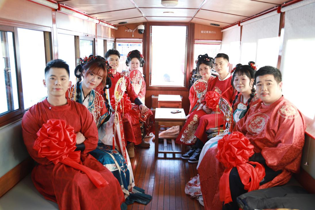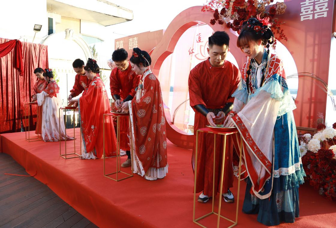 游船靠岸,主礼场内依次开展“沃盥入礼”“却扇结发”“信物与盟誓”“共牢合卺”等传统礼仪环节,每一项都蕴含着深厚的文化底蕴与美好的寓意。“沃盥入礼”,新人净手洁面,象征着以纯净之心开启婚姻生活;“却扇结发”,新娘轻启却扇,双方剪下青丝结成同心结,寓意着夫妻二人将相濡以沫、白头偕老;“信物与盟誓”,新人交换信物,许下对彼此的承诺,那坚定的誓言在空气中回荡,让在场的每一个人都为之动容;“共牢合卺”,新人共食一牲之肉,共饮合卺之酒,象征着夫妻二人从此同甘共苦、风雨同舟。整个主礼场内,弥漫着庄重而神圣的氛围,新人们在这传统礼仪的洗礼下,更加深刻地感受到婚姻的责任与美好。
