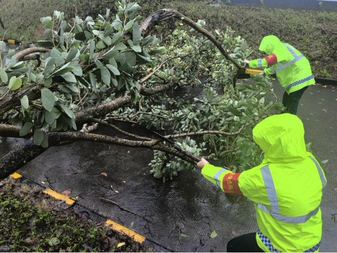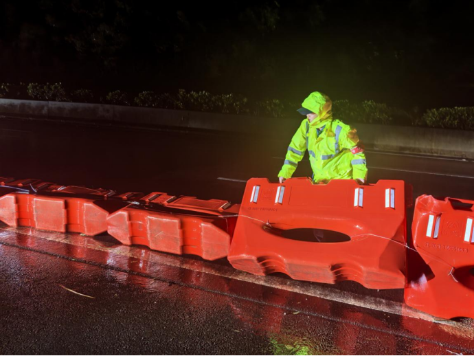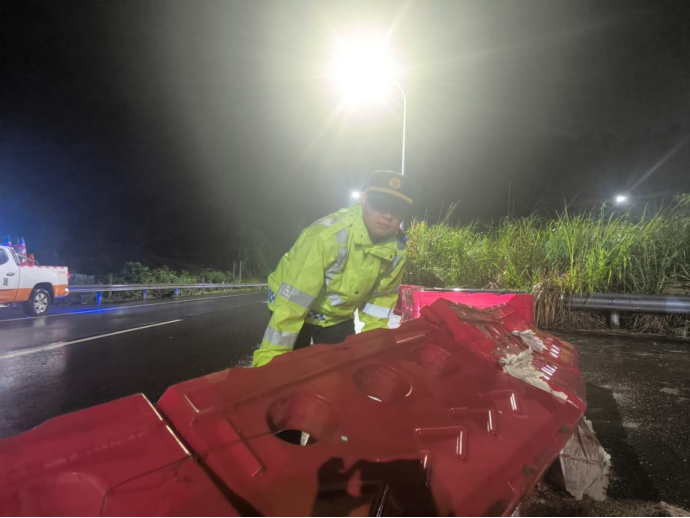 9月24日晚上8时,杜锦留巡逻至广州方向息村大山出口时,发现围蔽车道的大片水码被台风吹倒。他迅速做好安全警示,以最快速度维护好水码设施。随后,他便又投入到巡查清障工作中,与队友顶风冒雨,清理倒伏树木、维护交安设施……