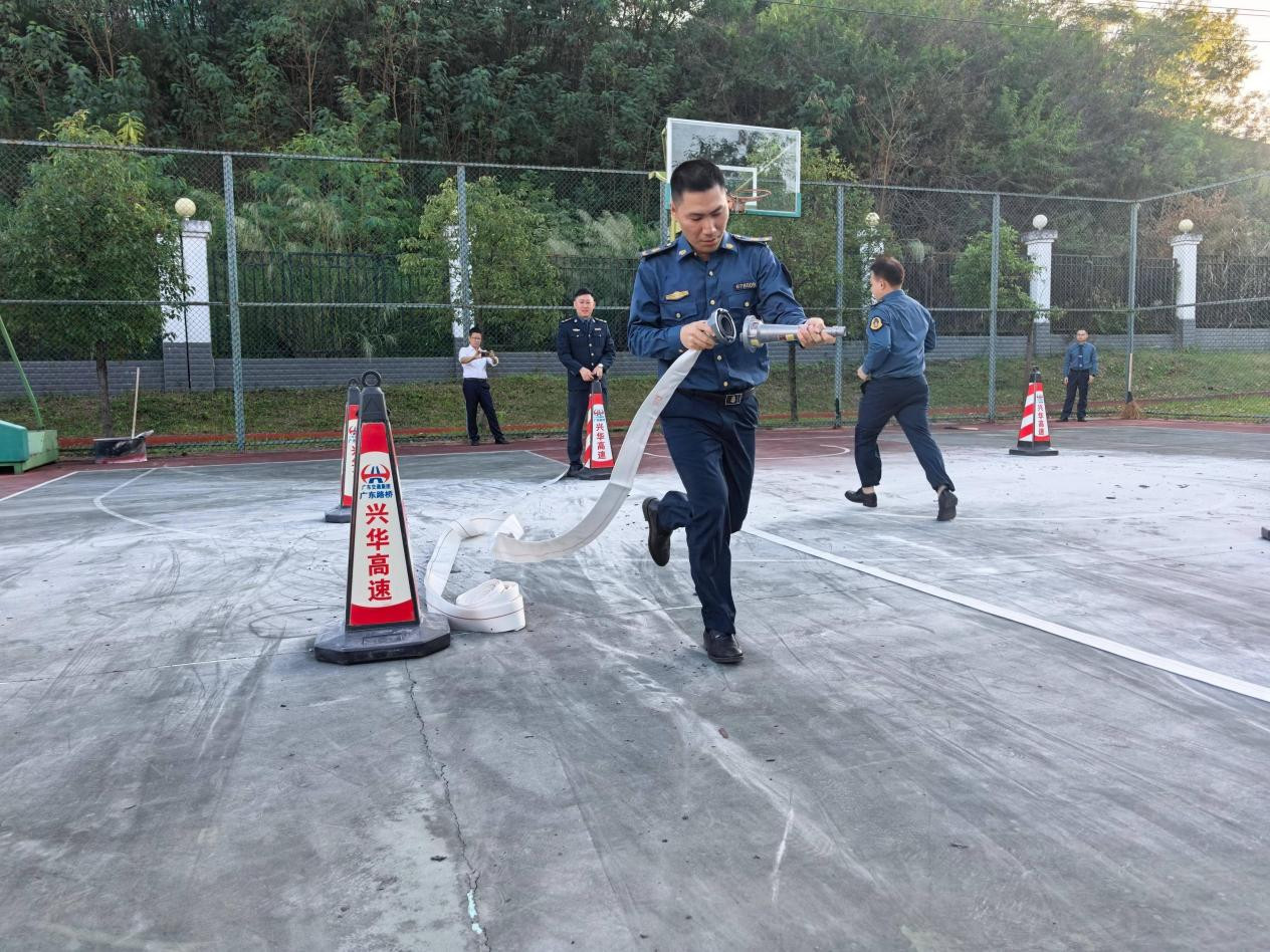 “快快快,我负责水枪和第一盘水带,你负责对接后面两盘!”随着一声哨声响起,本次竞赛的重头戏——“消防水带对接演练”正式开场。只见参赛队员们迅速进入“战时状态”,将水带用力甩出,霎时间,沉重的水带如同一条条绸带般在空中展开,而队员们则是在冲刺间完成水带、水枪之间的连接,动作干净利落,配合默契十足。