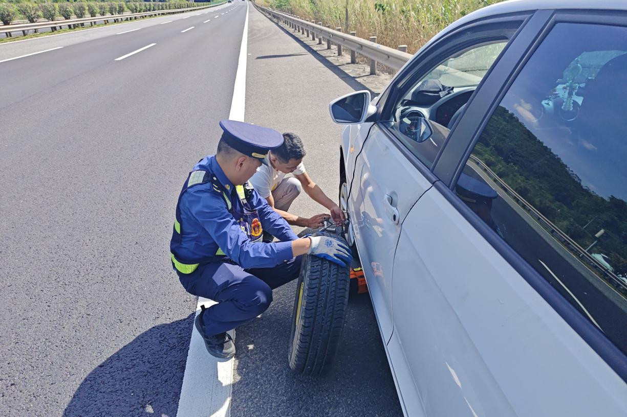 路政人员立即靠边停车,做好安全警示防护措施后上前询问情况。经了解,该车左前轮突发爆胎,司机因缺乏换胎经验,面对故障束手无策,正焦急万分地等待救援。考虑到高速公路上车流量大、车速快,长时间停留易引发交通事故,路政人员当即决定协助司机更换备胎。