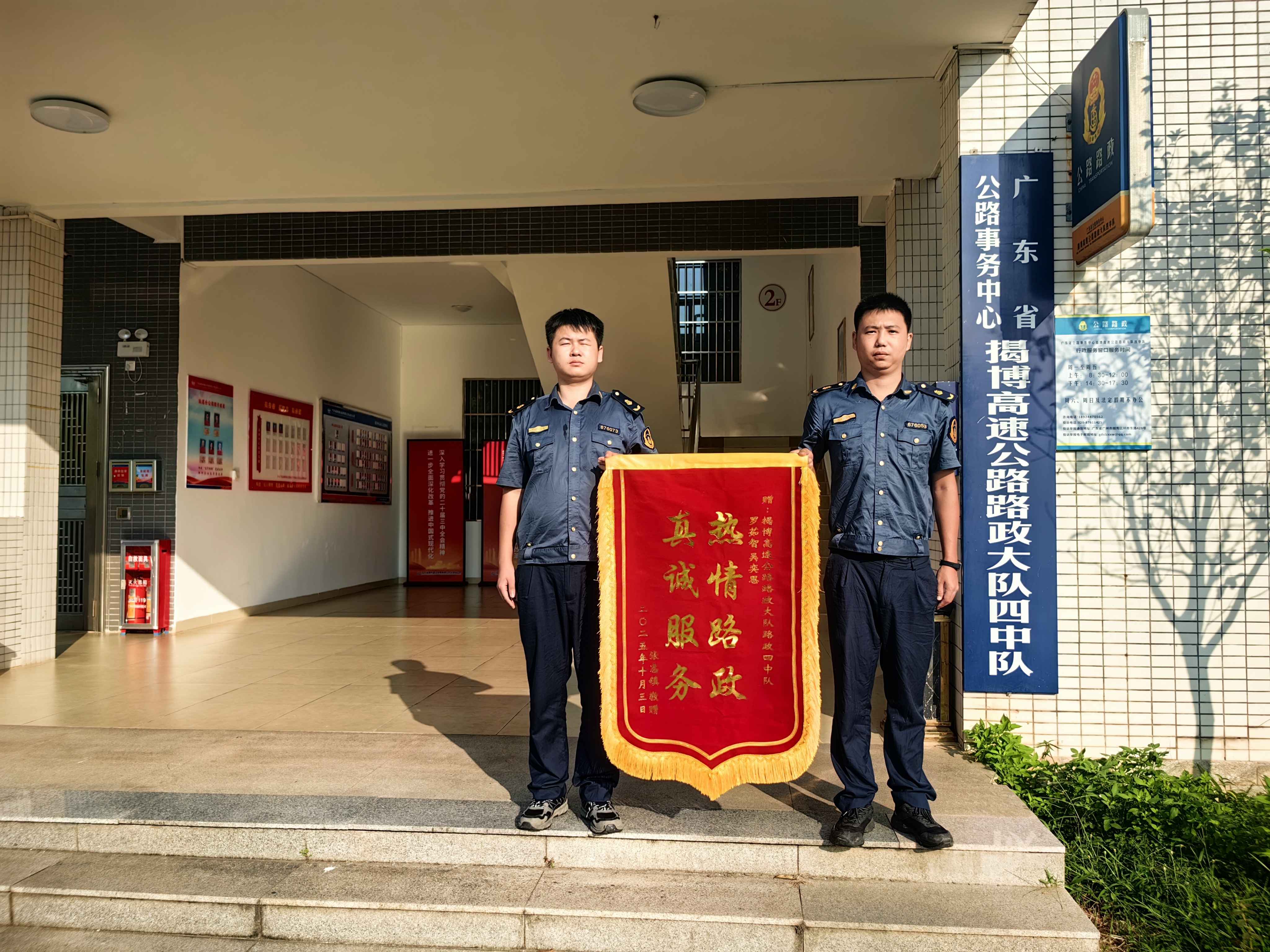 10月5日,揭博高速路政四中队收到车主张先生送来的锦旗,上面印着“热情路政,真诚服务”,以感谢路政人员此前的紧急救援。