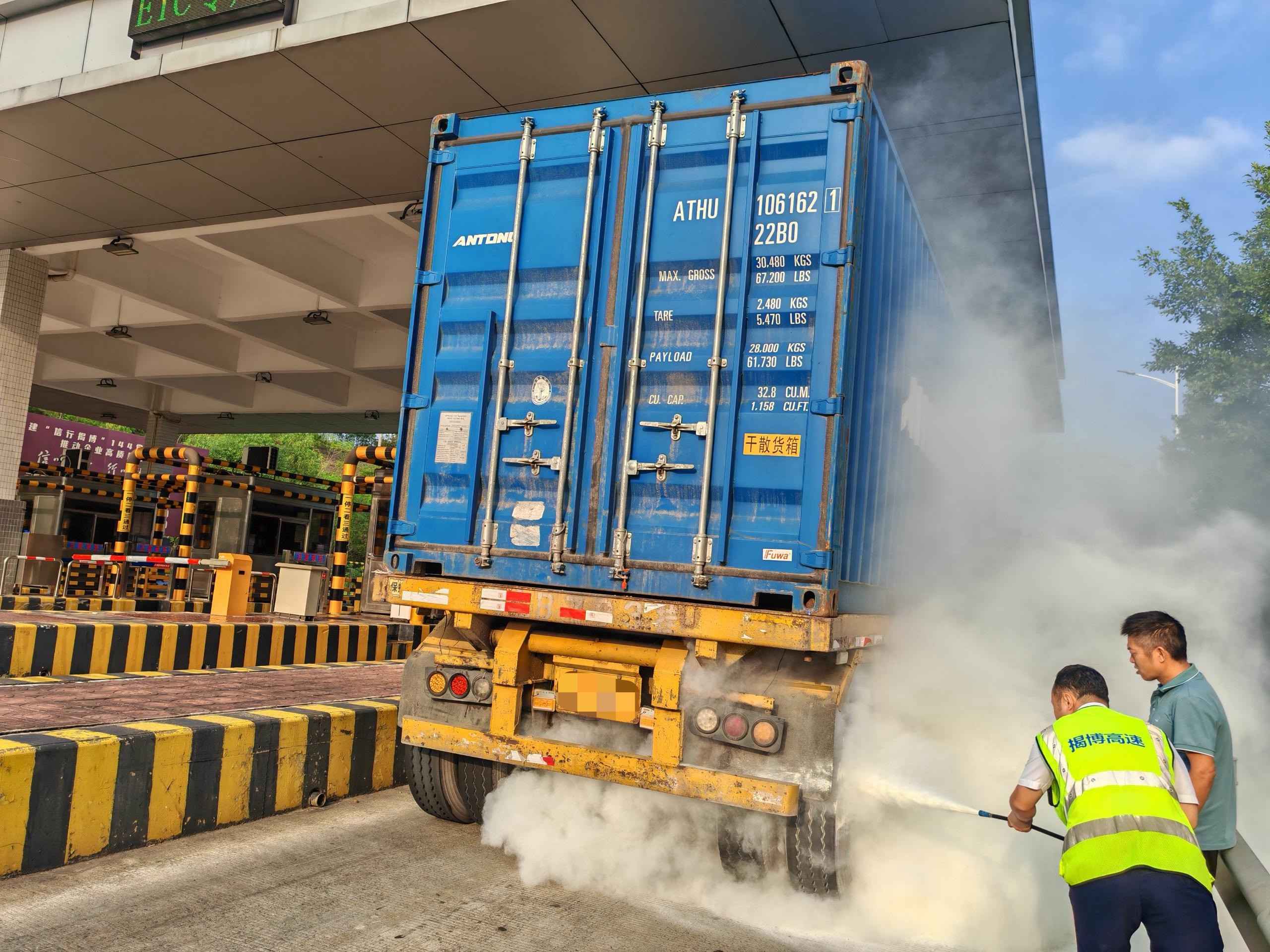 近日,在揭博高速蓝田站入口处,一辆粤L牌货车后轮突然冒出浓烟,紧接着蹿出火苗,且货车装载着货物,火苗随着风势不断蔓延,情况十分危急。当值工作人员程金生发现险情后,第一时间大声警示司机紧急下车,同时通过对讲机快速呼叫同事支援。