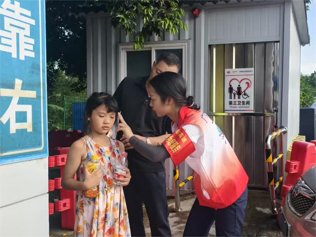 10月2日16时,一辆小车刚在鱼湾服务区停稳,后座一名面色苍白的小女孩踉跄下车、不停呕吐。见状,志愿者吴汝燕立即上前扶住女孩,细心帮她擦拭污渍并安抚情绪。