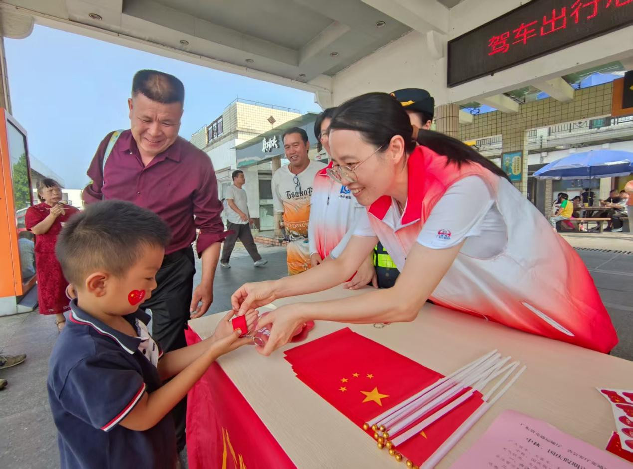 10月1日上午,曲江服务区内洋溢着一片欢声笑语。在广韶高速设置的国庆主题互动摊位上,整齐摆放着小国旗、“我爱中国”扇子、五星红旗钥匙扣和贴纸等小礼品。11名“小蚂蚁”志愿者分为两组,一组与过往的司乘进行互动游戏和知识问答,另一组则向大家派发节日小礼品。“石头—剪刀—布”,旅客们纷纷参与到活动中,一边和志愿者切磋手气,一边答题学知识,在轻松氛围中感受家国同庆的温暖。一位女士高兴地展示刚赢来的钥匙扣,“这是我国庆收到的第一份礼物,太有意义了。”