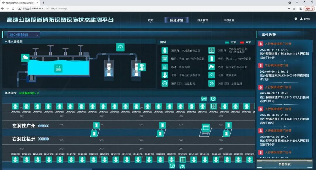 为弥补传统隧道巡检点位多、周期长、响应慢的短板,2025年9月,云梧高速以鹅公髻隧道为试点,布设隧道智能消防监测系统,依托物联网、传感技术、人工智能、大数据分析,构建数字可视化平台,利用现场传感器将隧道消防设施的精准定位与状态,实时传回位于监控中心的监测平台,真正实现对隧道消防设施的全天候24小时智能监测,成为省内首个基于隧道消防布设多维度监测系统的高速项目。