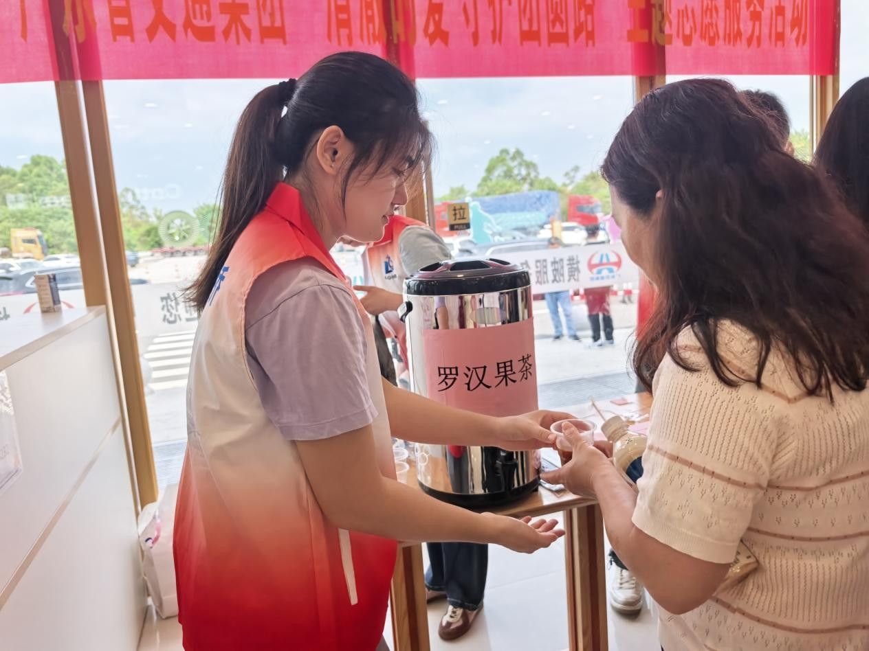 与此同时,一旁的志愿服务点也是人头攒动,不少司乘在这里领取一杯热乎的罗汉果茶,缓解长途驾驶的疲惫。“小朋友是不是晕车了?来,姐姐这里有晕车贴,贴上能舒服点。” 从路线咨询到应急药品,从免费茶水到搬运行李,志愿者们用温馨叮嘱、热情服务,让司乘的归家旅途少了一丝疲惫,多了一点感动。