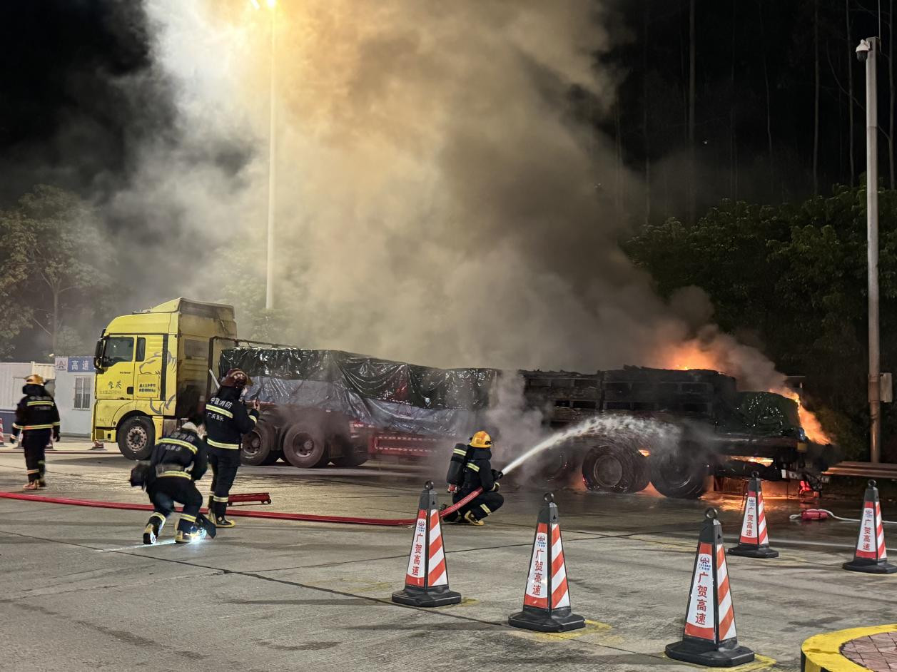 10月22日21时许,一辆六型货车驶出广东交通集团所属广贺高速广宁站出口时,突发爆胎,后轮随即起火,现场浓烟滚滚,情况危急。