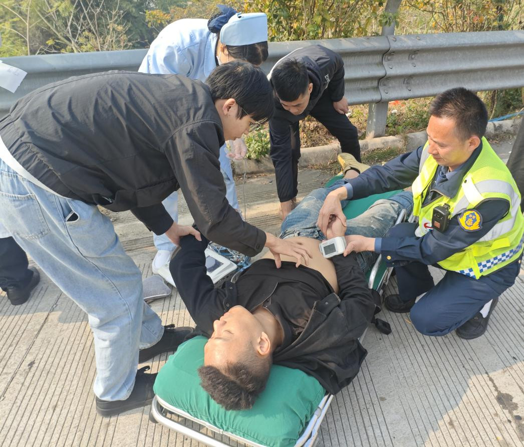 在等待救护车期间,为了缓解陈先生的不适,吴伟军、刘万与副驾乘客合力将陈先生平稳抬出驾驶位,解开安全带、保持原地平躺、轻揉四肢缓解痉挛,并不停安抚其情绪。20分钟后,120急救车抵达,吴伟军又协助医护人员将陈先生抬上担架,贴心叮嘱随行家属带好证件,目送救护车驶远才安心返回岗位。