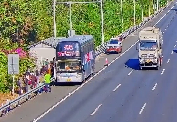 近日,在广东交通集团所属揭博高速往广州方向水墩隧道口,一辆载有45名乘客的粤D牌大巴车因发动机过热抛锚在应急车道。揭博高速路政人员就近利用“信行驿站”应急资源,迅速完成处置并妥善安置滞留乘客。