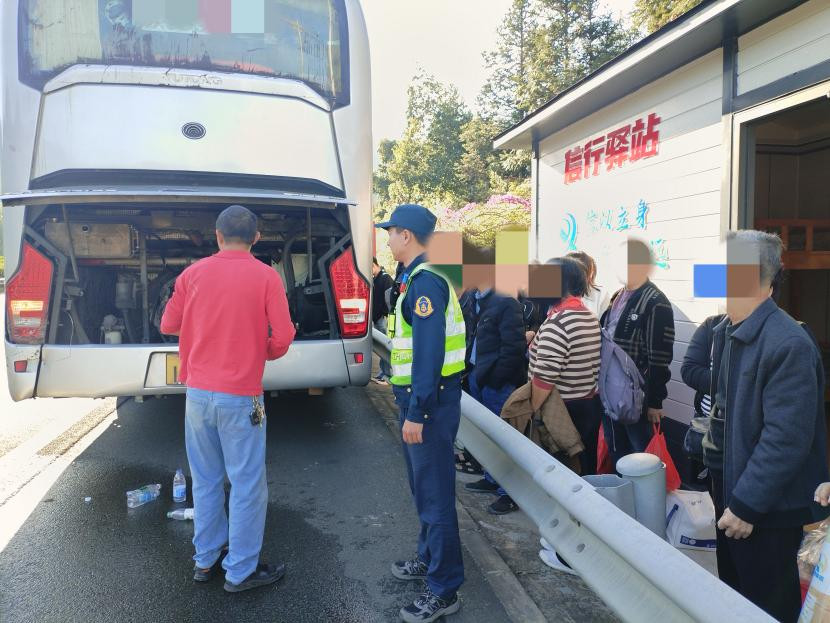 当日14时许,揭博高速路政二中队接报后,路政员叶燕生、钟佳辉迅速抵达现场,发现故障车就停放在“信行驿站”旁,但多名乘客仍滞留车内,存在严重二次事故风险。路政员迅速分工:一人拉响警笛,用交通锥延伸防护区域,引导后方车辆避让;另一人有序将45名乘客转移至护栏外安全地带。