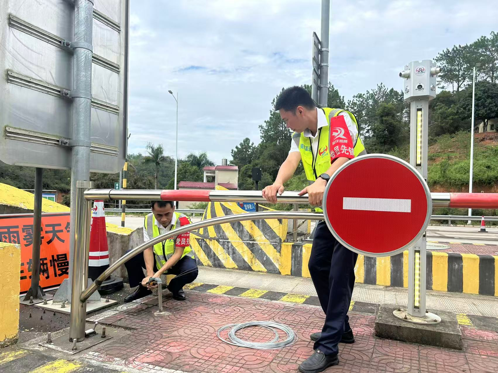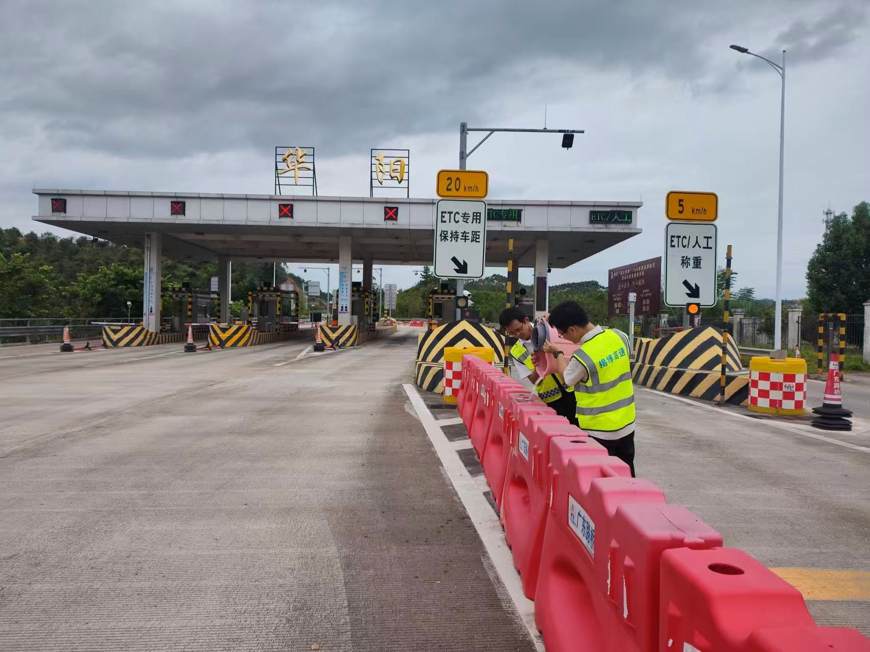 揭博高速工作人员在加固收费设施(摄影:黄佳颖)