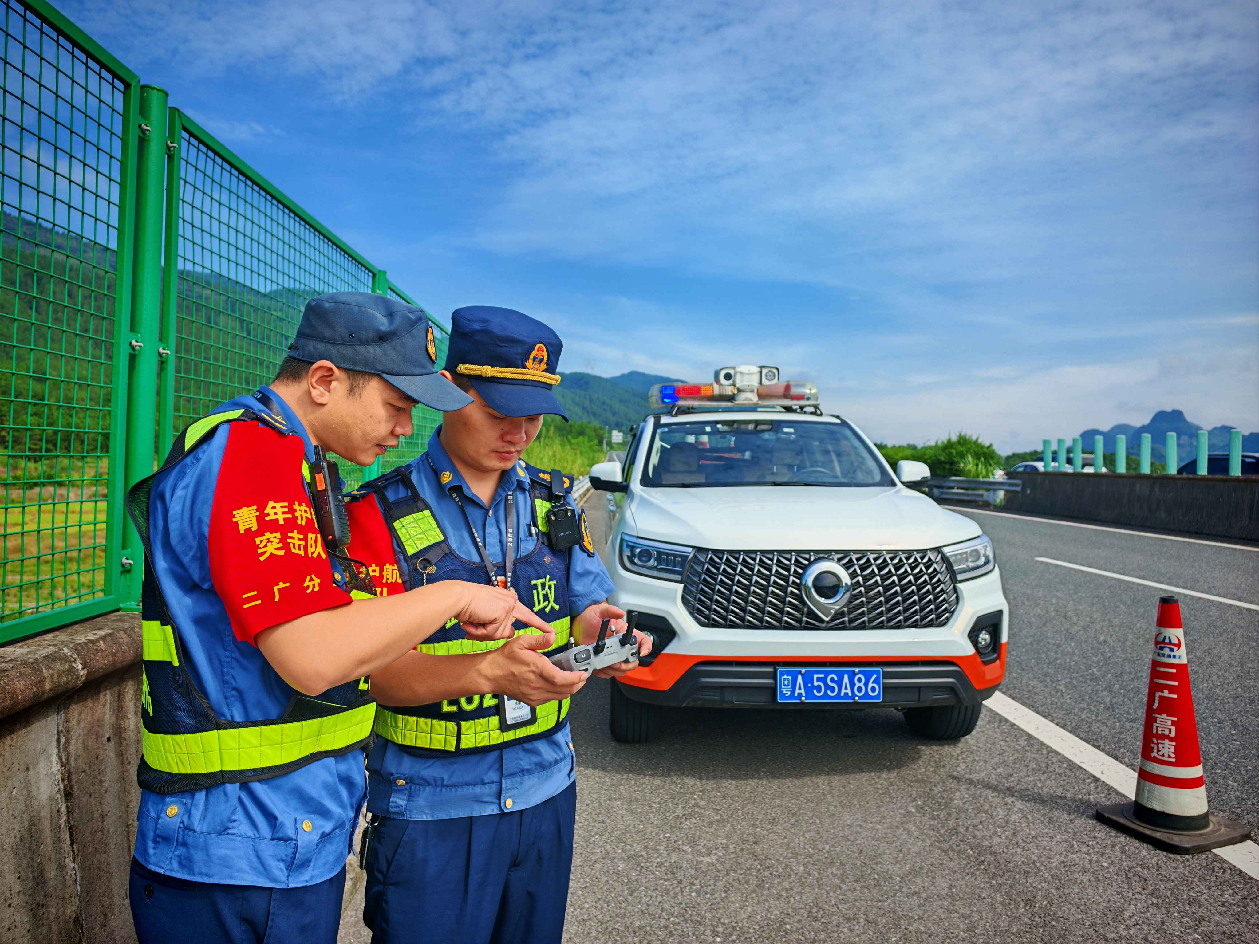 国庆中秋假期正式开始,路面车流量逐渐增大,广东交通集团所属二广高速路政人员坚守交通一线,加强路面巡查,及时处置突发事件,并为过往司乘人员纾难解困,全力守护司乘人员的回家路。