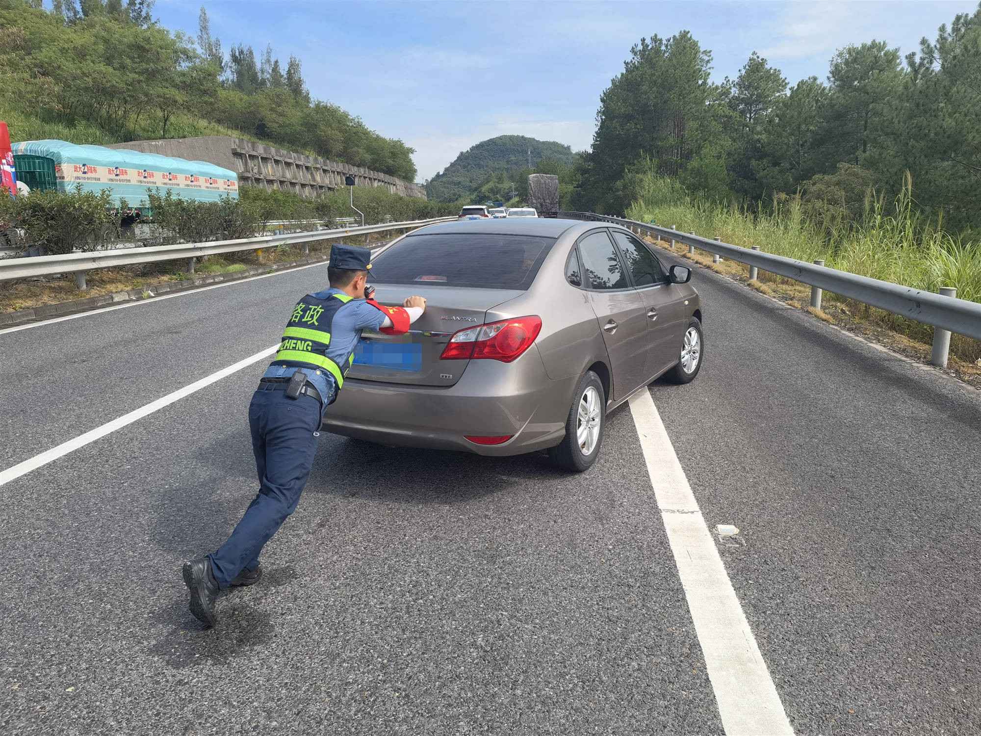 路政员将车推至应急车道 摄影:汤柏彬