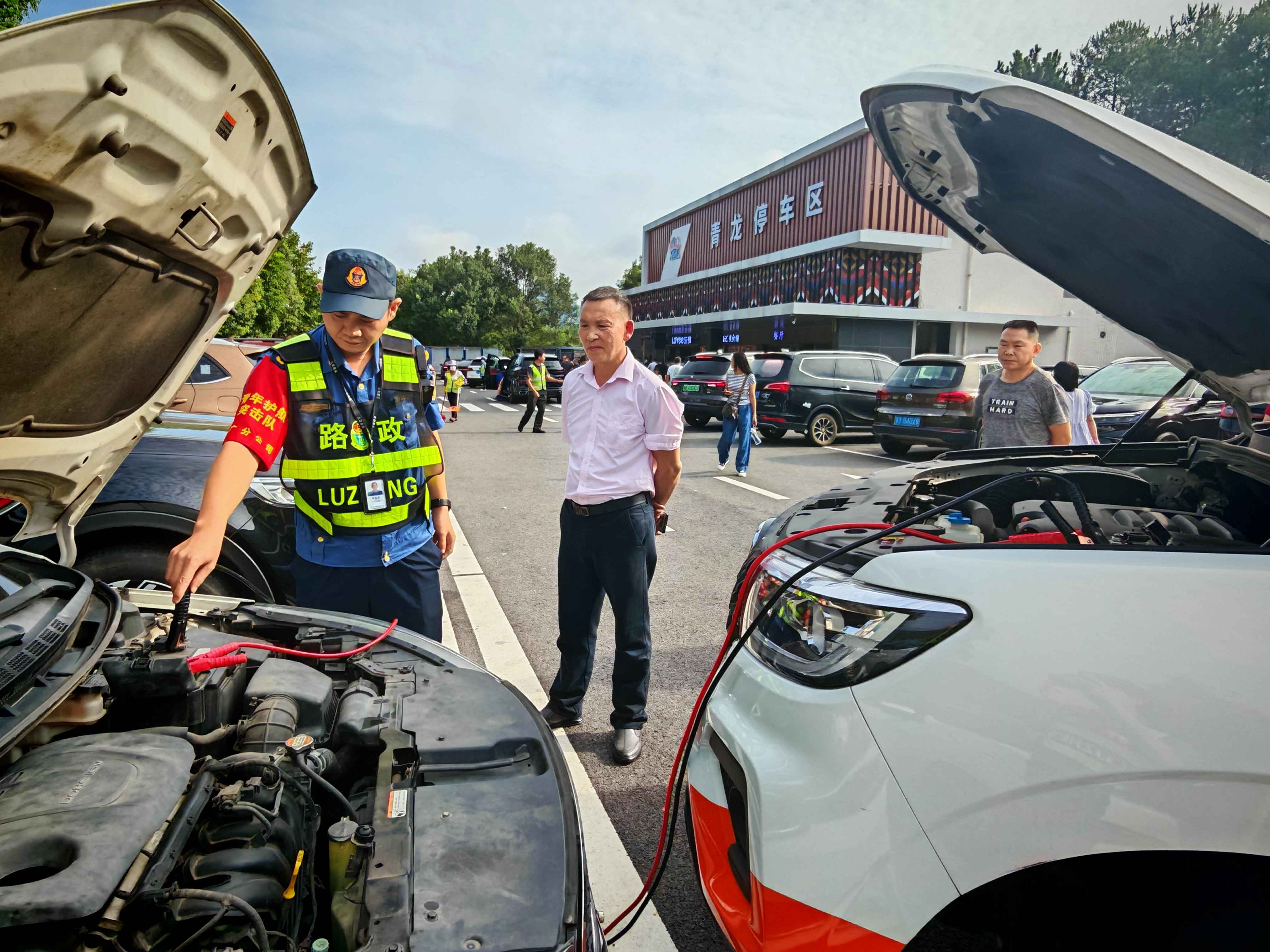 在征得雷先生同意后,李孟奇打开引擎盖仔细检查,初步判断为电瓶亏电,随即从巡逻车中取出搭电线为故障车搭电。
