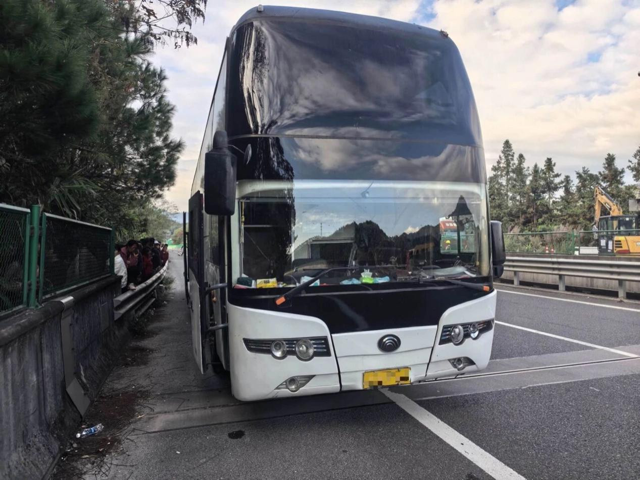 经了解,该车为宁夏某旅游团的载客车辆,搭载58名司乘人员前往广东中山,途经该路段时,车辆突然爆胎,无法正常行驶,初步检查后发现,车辆可以缓慢移动。