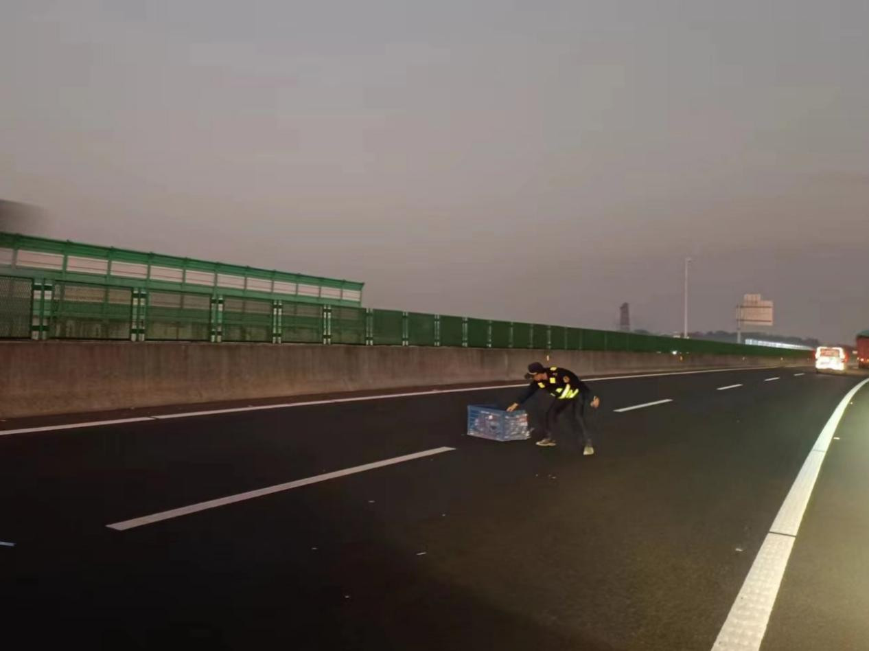 路政人员接报后赶赴现场,在规范设置安全警示标识后,分工协作、高效作业,清理路面散落物并转运至巡逻车。从监控发现险情到道路恢复正常通行,全程耗时仅7分钟,最大限度降低了二次交通事故风险。