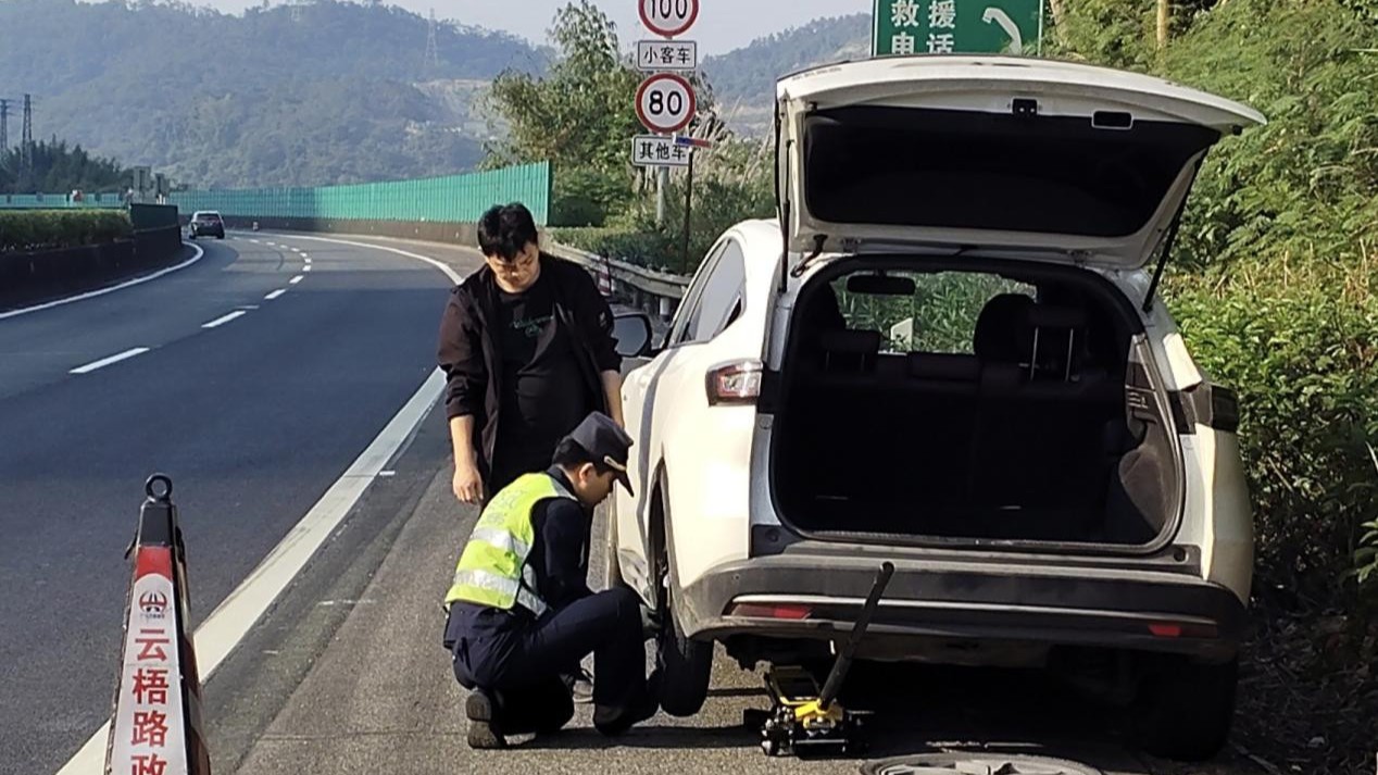 车辆爆胎陷困境,云梧高速路政员秒变“维修工”暖心救援