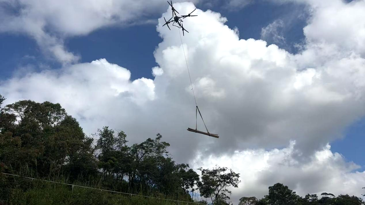 整个过程操作精准、高效,充分展现了无人机在复杂地形下的施工优势。