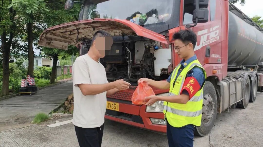 9月23日中午,云梧高速郁南站收费班长刘志雄在广场执勤时,发现一辆粤A牌油罐车静静停在外广场,便上前敲窗提醒。