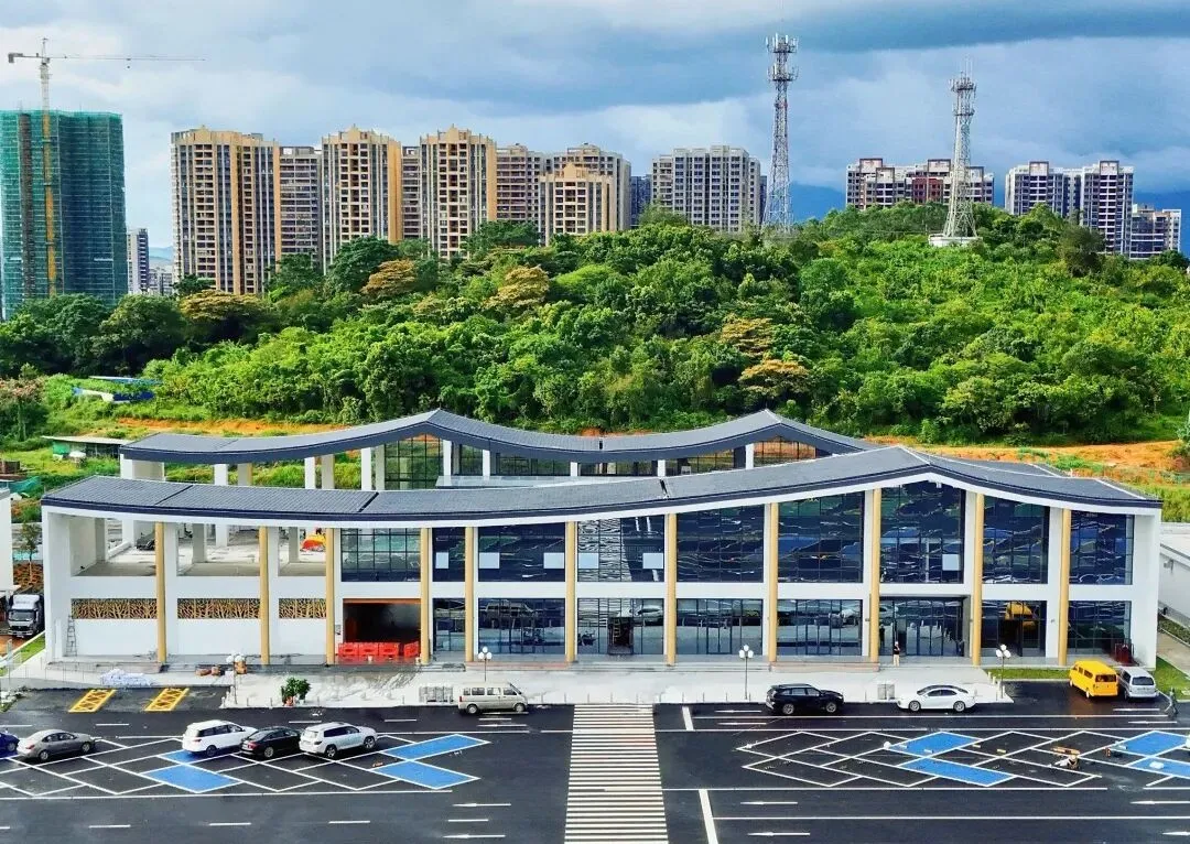 设计团队运用“三夹腾龙”划龙舟的动态意象,在外观上营造出龙舟蓄势待发的建筑形态,通过现代材料与灯光设计,展现传统文化与现代科技的融合之美。服务楼内设有岭南文化场景及助农兴业展厅,集中展示龙舟模型、咏春拳木桩等非遗项目,并上线腐竹、花生、龟苓膏等20多种本地农特产品,方便旅客一站式选购。