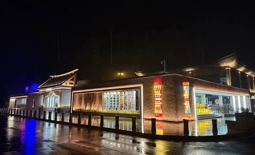 服务楼外观独具匠心,外立面设置了由154面瑶绣组成的“景观墙”,灵动别致。夜幕降临时,墙灯缓缓亮起,与一旁立体腰鼓相映成趣,远远望去,整个服务区仿佛被“瑶绣织就的光影”包裹,形成一道独特视觉印记。