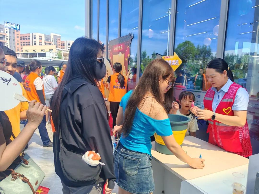 粤东分公司在长沙湾服务区设“能量补给站”,免费提供罗汉果茶、月饼、柚子,还组织20余名志愿者帮新能源车车主操作充电设备,化解“续航焦虑”。同时,非遗拓印、投壶游戏区成亲子互动热门打卡点,家长孩子共同制作国庆主题拓印作品,欢声笑语不断。
