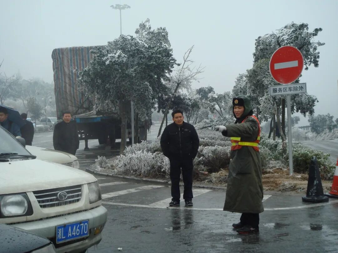 服务区员工在冰雪中疏导交通