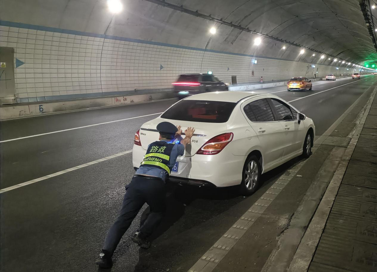 经了解,车主宋先生一家驾车出游途中,车辆突然断电熄火,多次尝试启动均无果,只能等待救援,粤运救援车辆预计20分钟后抵达。为避免第三车道长时间被占用、加剧通行压力,二人当即决定协助推车至隧道内的港湾停车区临时停放。过程中,王宁在车辆后方持警示器材引导避让,黄志鹏则配合宋先生推车。