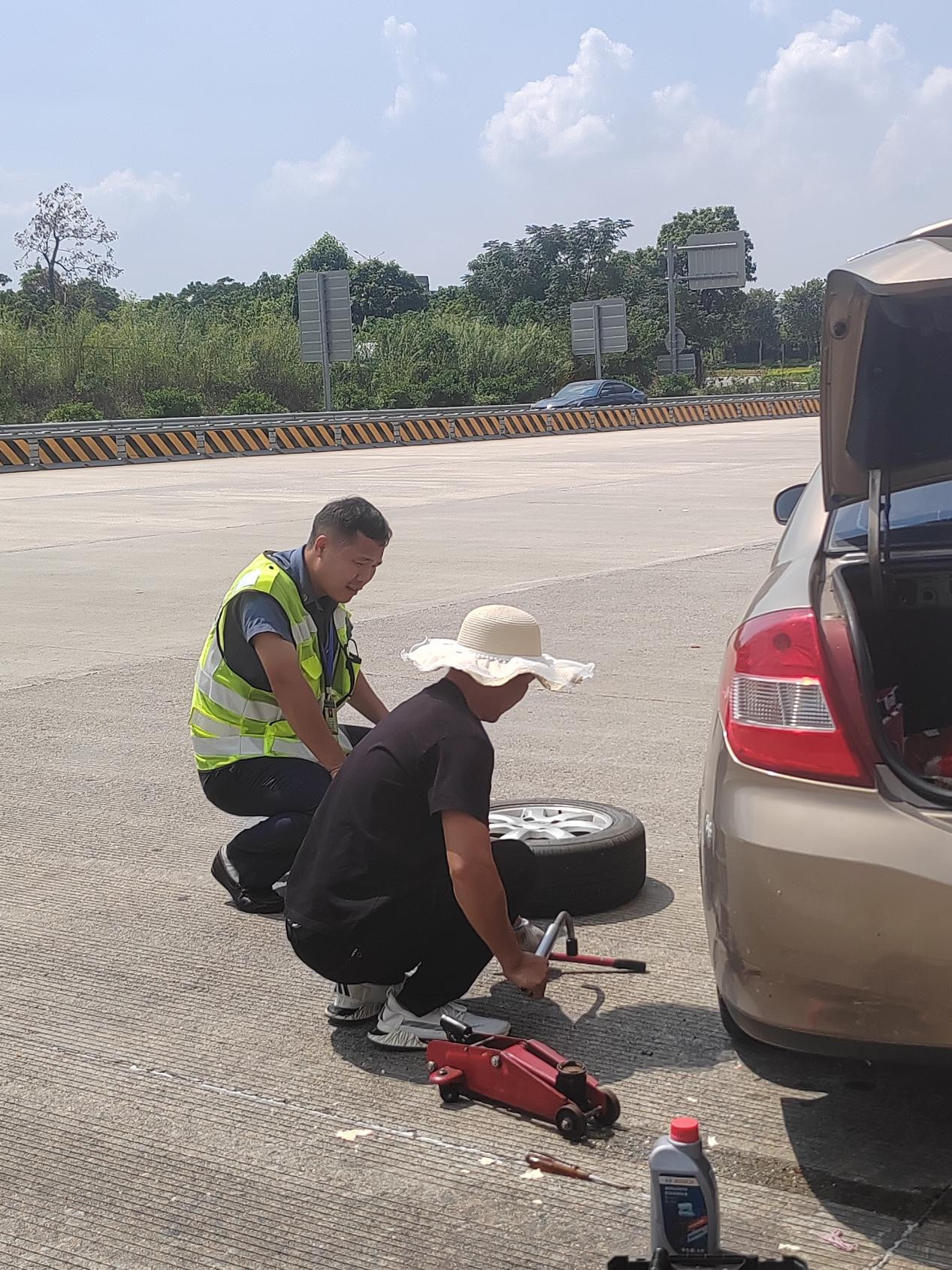 “我从广州出发去清远探亲,途中发现有轮胎漏气情况,便驶出高速了,检查后确认是爆胎,我从未换过轮胎,正想通过手机找教程,还好你们过来帮忙了!”司机李先生看到当值工作人员,长舒一口气说道。
